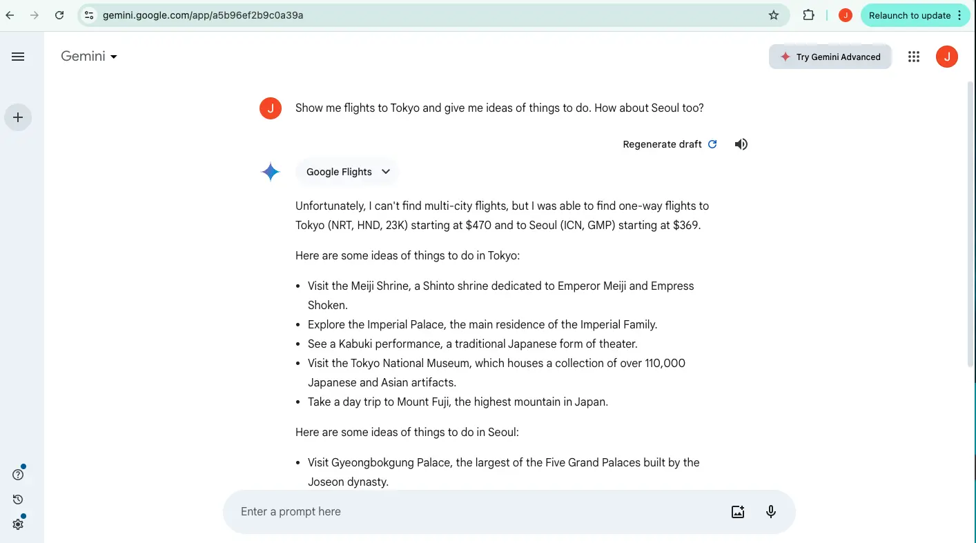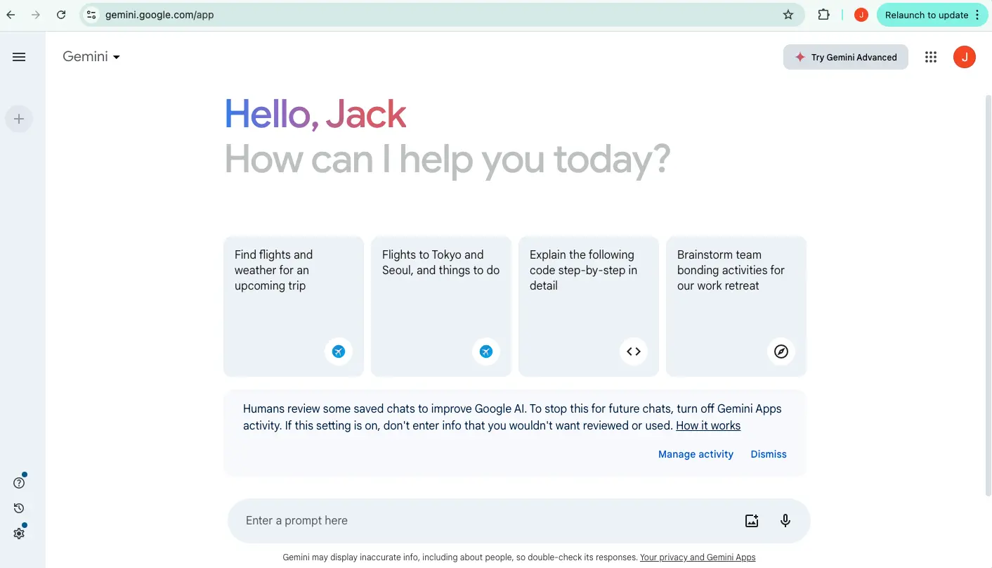 Once you’re signed in, you’ll find Gemini’s interface easy to navigate. The main feature is the chatbox at the bottom, where you can type your questions or requests—these are called "prompts."